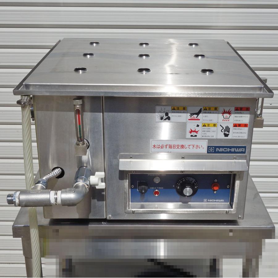 サイズ 幅500×奥行550×高さ340mm、電源 三相200V 50/60Hz 各種の蒸し物を美味しく蒸し上げます^^* 調理待機中の温度はサーモスタットで調節♪ 温調サーモスタットで保温運転もできます。 自動給水タイプなので、給水の手間が掛からず、長時間安定して蒸気が得られます。 一目で水量が確認できる水位計、空焚き防止装置付。 弊社『ヤフーオークションブース』と『ヤフーショッピング』にて販売中! 是非ご覧くださいませ(^^* https://auctions.yahoo.co.jp/seller/nihonhouei?ei=UTF-8&sid=nihonhouei&s1=bids&o1=a&slider=0 https://store.shopping.yahoo.co.jp/town-houei/